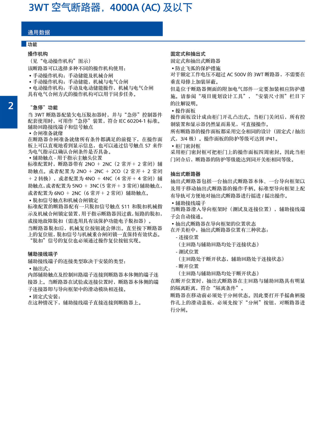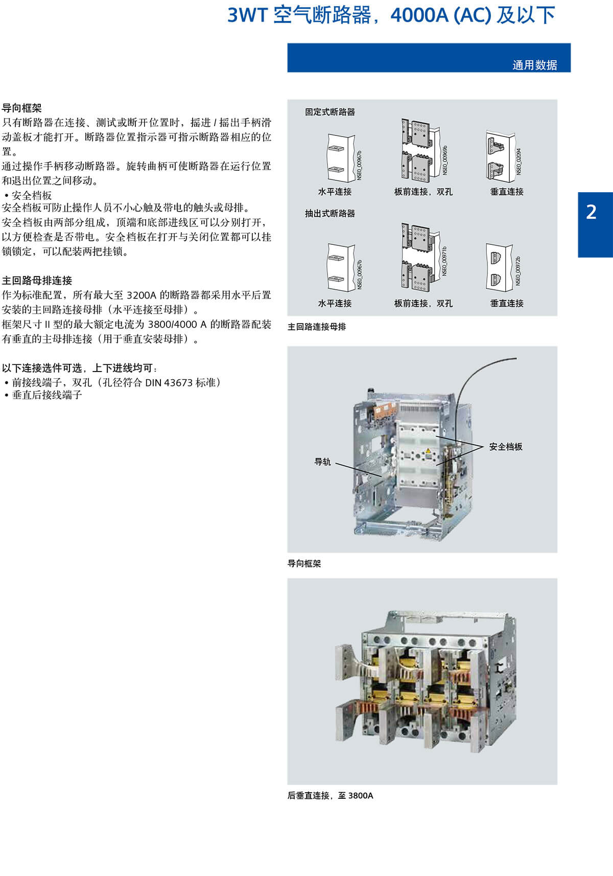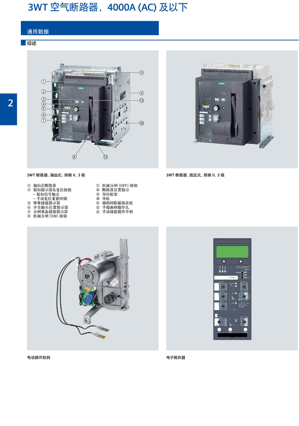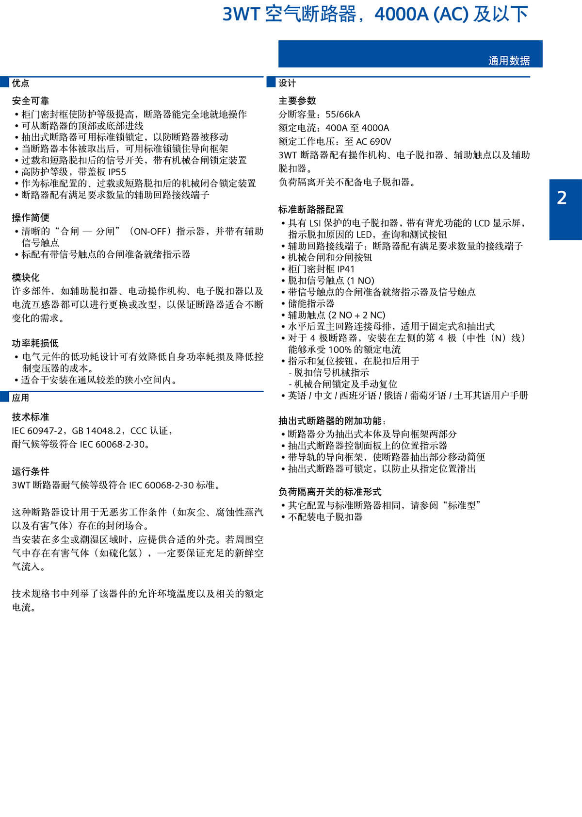 灵活性• 电子脱扣器(ETU),具有优异性能。• 仅两种框架规格包含一系列广泛应用:400A 至 4000A;额定短路分断容量最高可达 66KA;3 极或 4 极;固定式及抽出式安装。• 所有部件均采用模块化设计。易于使用• 便于用户规划、组态、安装和操作。• 两种壳架规格的多种附件均可轻松改装。• 所有电子脱扣器均标配中文液晶显示。
