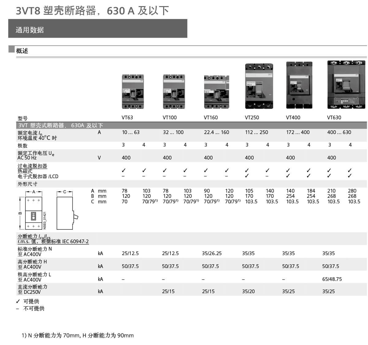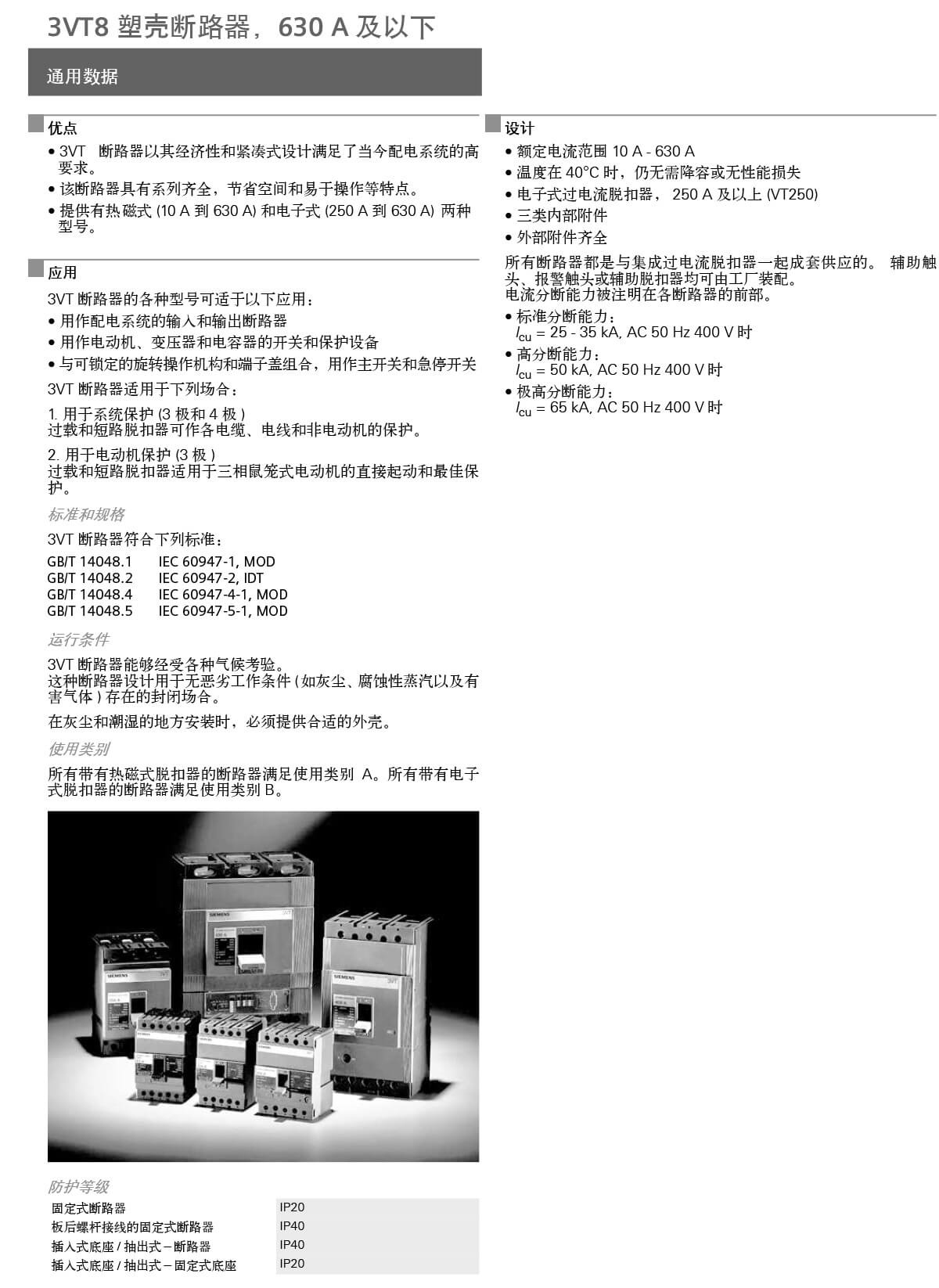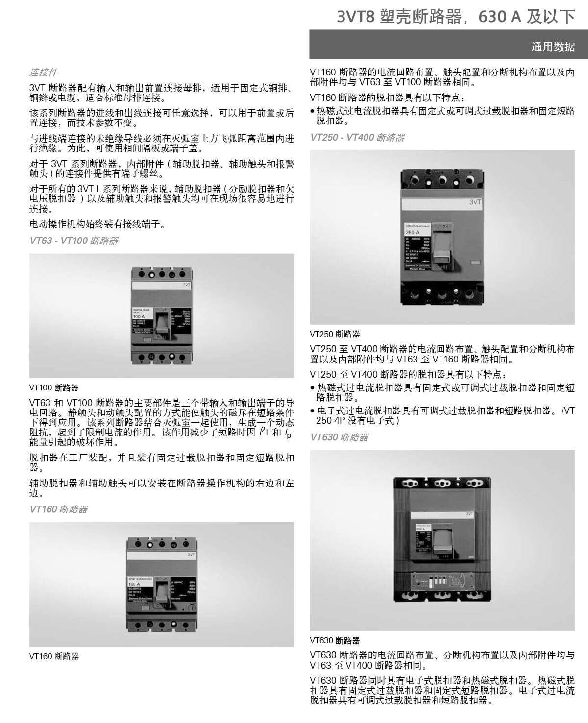 3VT 断路器的各种型号可适于以下应用:• 用作配电系统的输入和输出断路器• 用作电动机、变压器和电容器的开关和保护设备• 与可锁定的旋转操作机构和端子盖组合,用作主开关和急停开关3VT 断路器适用于下列场合:1. 用于系统保护 (3 极和 4 极 )过载和短路脱扣器可作各电缆、电线和非电动机的保护。2. 用于电动机保护 (3 极 )过载和短路脱扣器适用于三相鼠笼式电动机的直接起动和最佳保护。
