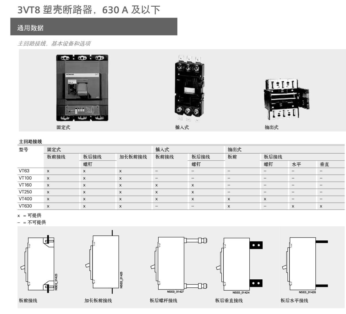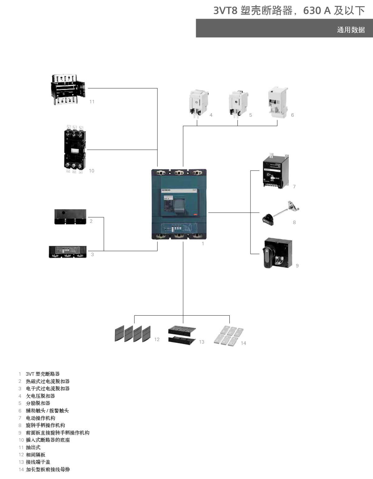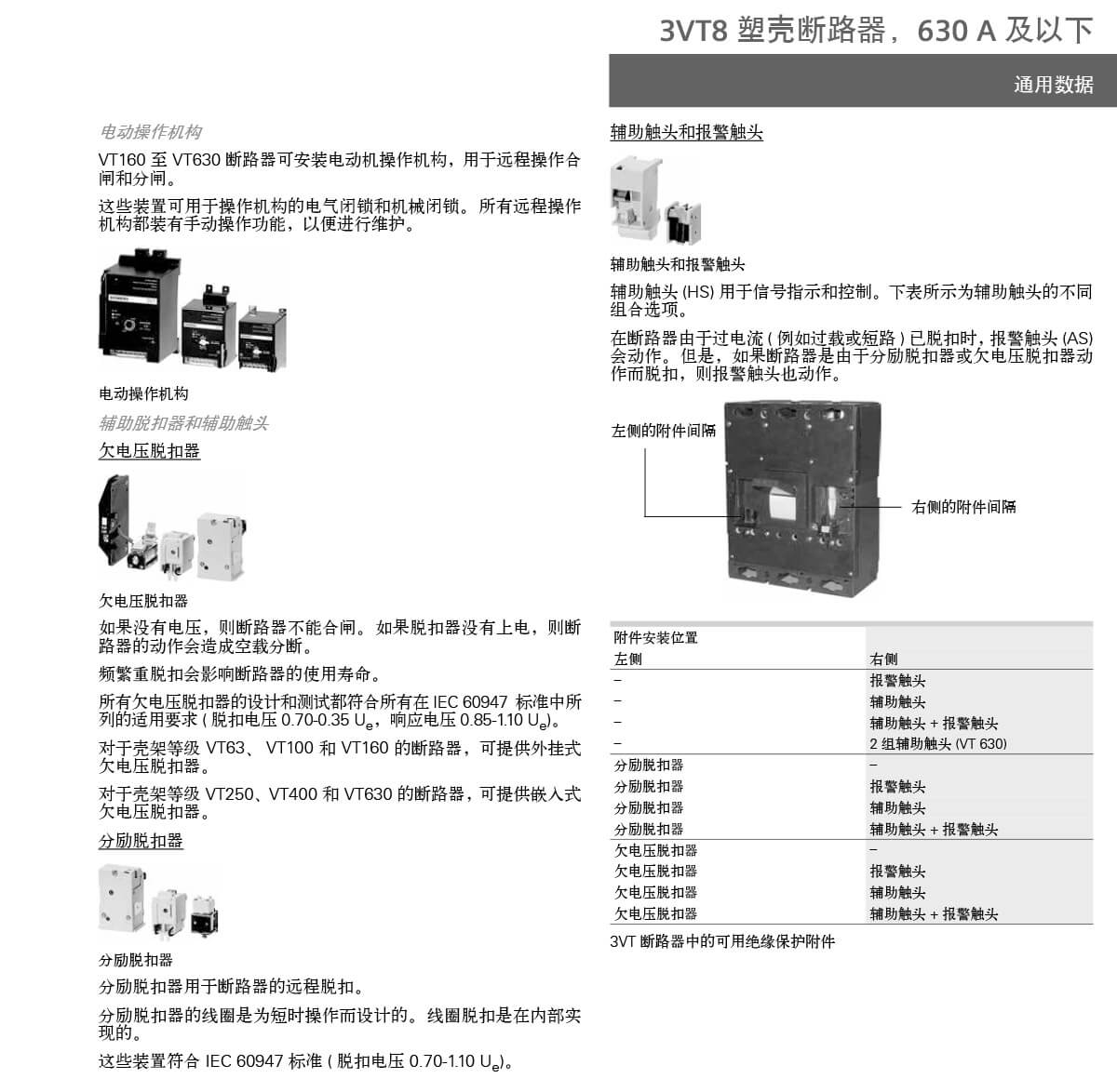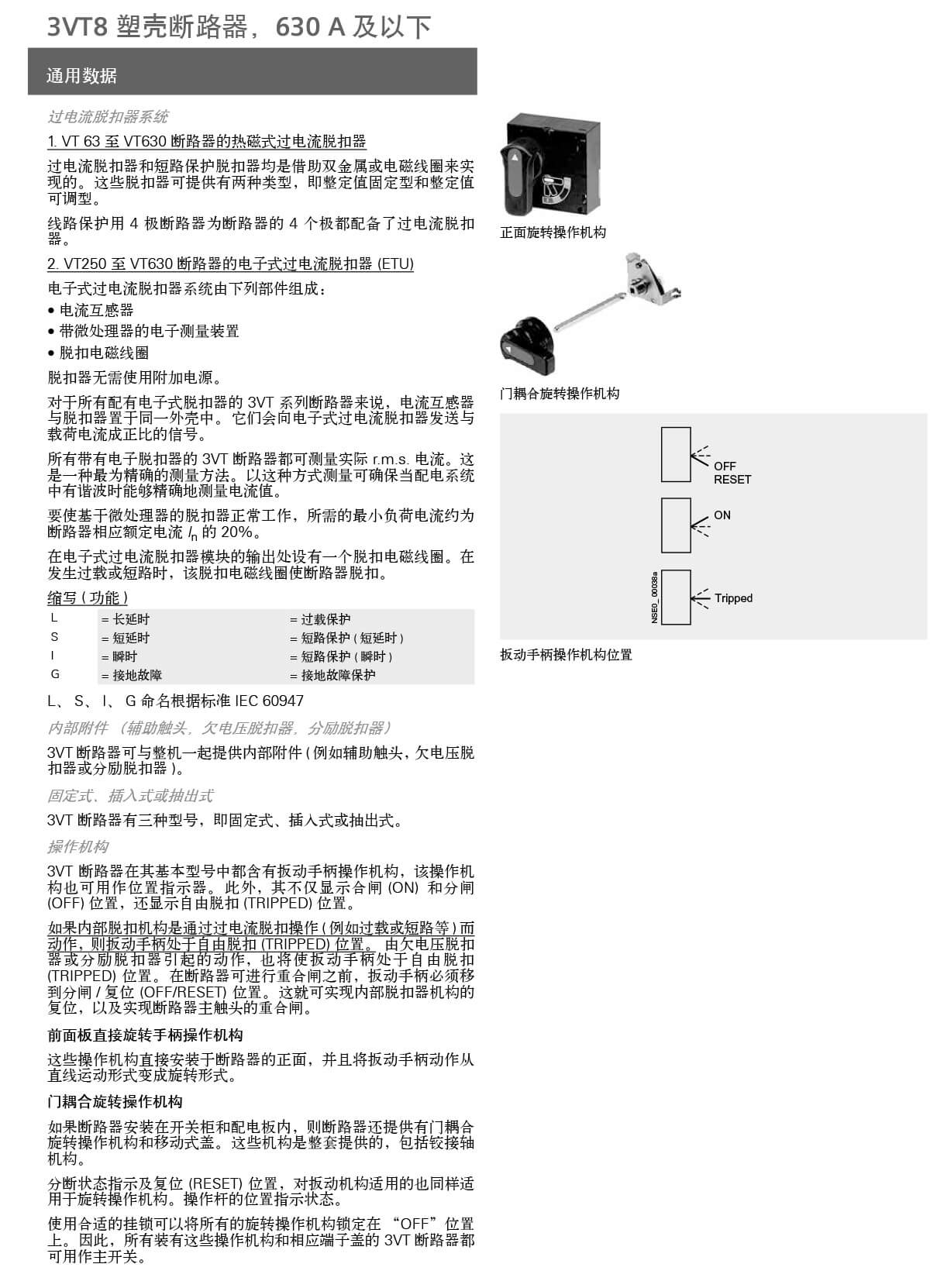 3VT 断路器的各种型号可适于以下应用:• 用作配电系统的输入和输出断路器• 用作电动机、变压器和电容器的开关和保护设备• 与可锁定的旋转操作机构和端子盖组合,用作主开关和急停开关3VT 断路器适用于下列场合:1. 用于系统保护 (3 极和 4 极 )过载和短路脱扣器可作各电缆、电线和非电动机的保护。2. 用于电动机保护 (3 极 )过载和短路脱扣器适用于三相鼠笼式电动机的直接起动和最佳保护。