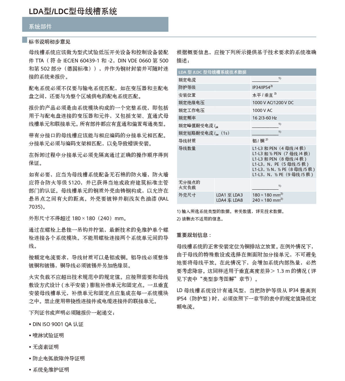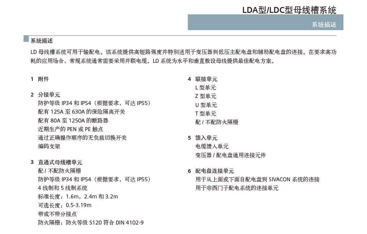 LD 母线槽系统可用于输配电。该系统提供高短路强度并特别适用于变压器到低压主配电盘和辅助配电盘的连接。在要求高功耗的应用场合,常规系统通常需要采用并联电缆。LD 系统为水平和垂直敷设母线提供最佳配电方案。