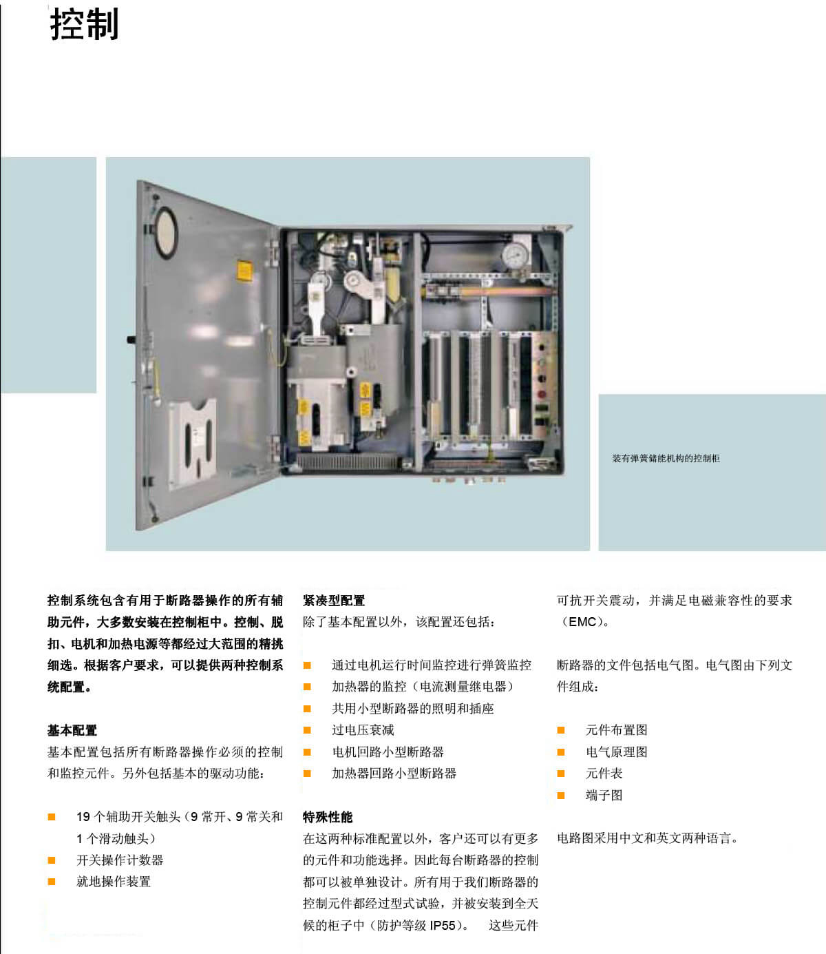 控制系统包 含有 用于断路器操作的所有辅助元件 , 大多数安装 在 控制柜中 。 控制 、 脱扣 、 电机和加热电源 等 都经过大范围的精挑细选 。 根据客户要求 , 可以提供两种控制系统配置 。