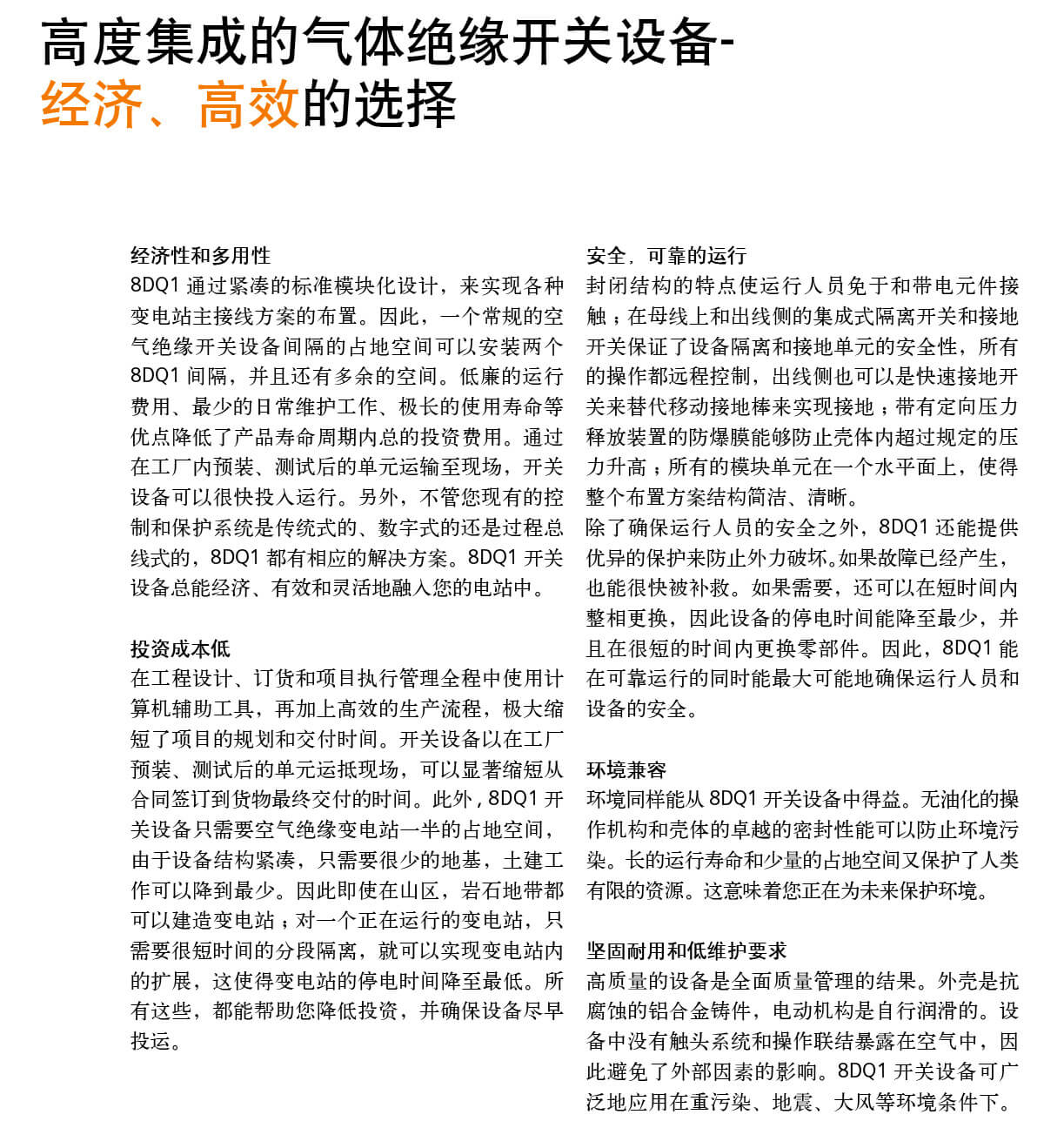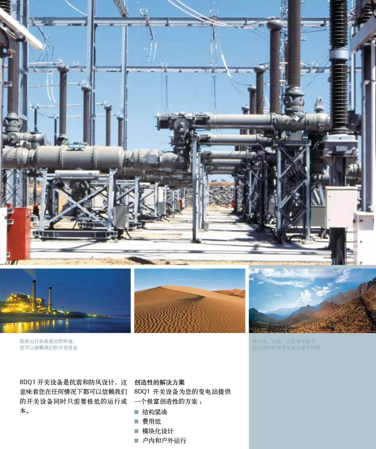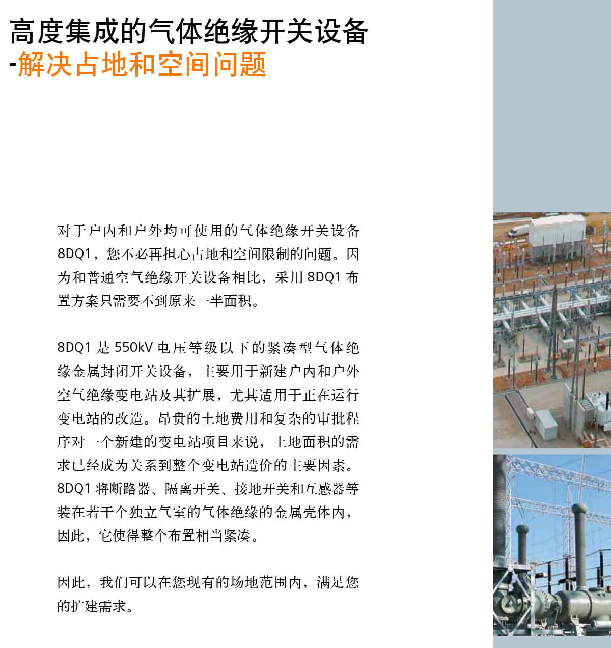 8DQ1 是 550kV 电压等级以下的紧凑型气体绝缘金属封闭开关设备,主要用于新建户内和户外空气绝缘变电站及其扩展,尤其适用于正在运行变电站的改造。昂贵的土地费用和复杂的审批程序对一个新建的变电站项目来说,土地面积的需求已经成为关系到整个变电站造价的主要因素。8DQ1 将断路器、隔离开关、接地开关和互感器等装在若干个独立气室的气体绝缘的金属壳体内,因此,它使得整个布置相当紧凑。
