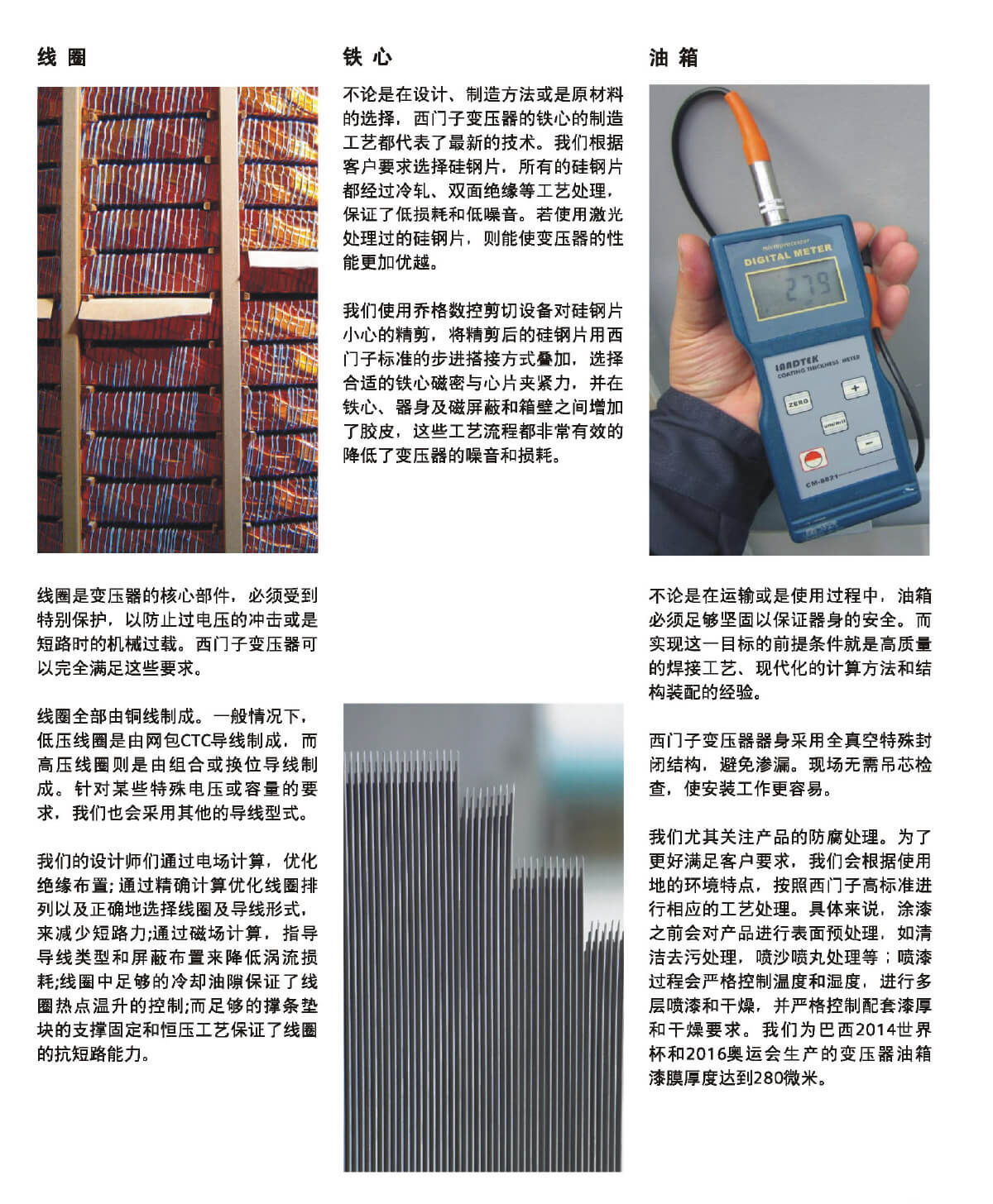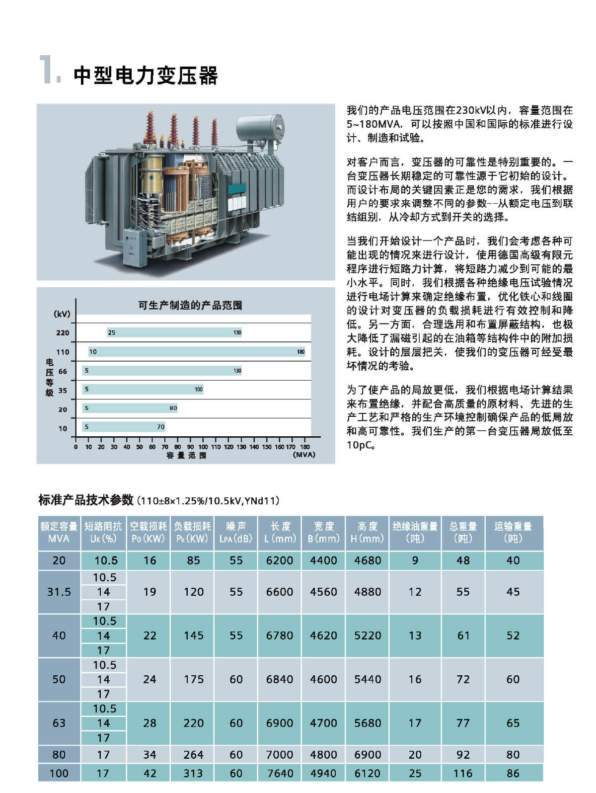 我们的产品电压范围在230kV以内,容量范围在.5~1 80MVA,可以按照中国和国际的标准进行设计、制造和试验。对客户而言,变压器的可靠性是特别重要的。一台变压器长期稳定的可靠性源于它初始的设计。而设计布局的关键因素正是您的需求,我们根据用户的要求来调整不同的参数--从额定电压到联结组别,从冷却方式到开关的选择。